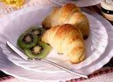 乾酵母 ... 11/3匙 高筋麵粉 ... 180克 糖 ... 1大匙 蛋 ... 1個 溫水 ... 105克 低筋麵粉 ... 20克 鹽 ... 1/2匙 牛奶 ... 適量 奶油 ... 100克 烹飪過程圖一 烹飪過程圖二 烹飪過程圖三 烹飪過程圖四 烹飪過程圖五 烹飪過程圖六 作法步驟: 麵糰部份做其它麵包一樣將之和好,揉到均勻光滑,再蓋好放溫暖處發酵30分鐘。 桌上撒些麵粉,麵糰桿成長方形。 奶油放中間,兩邊麵皮往中間包,接口捏緊。包好放入冰箱鬆弛20分鐘。 取出麵糰桿開、三折、鬆弛兩次(共折疊3次),然後取出桿成0.3公分厚的薄片。 中間發酵15分鐘,再用輪刀切成12個長三角形,在長三角形底部直切一刀。 表面塗一點牛奶,捲起成牛角狀,排在烤盤上,放溫暖處最後發酵 35-40分鐘,塗點牛奶即可烤焙。 備註: 1.奶油買較硬的種類,不要買"超軟"的。使用時還須控制溫度使之硬適中,如果冰得太硬,包好後一桿就會戳破麵皮,太軟了容易流出。 2.所有的丹麥麵包最後發酵溫度都只要35℃左右就夠了,不須到38℃,因為溫度太高麵糰裡的奶油可能會融化而漏出來。 3.可頌麵包也可以包餡再烤,如包奶油布丁、杏仁糖霜等;烤好後也可以切開夾餡或加上表面霜飾如蛋白糖霜、杏仁片等。 4.丹麥麵包是以麵糰包裏奶油,反覆折疊而成,可分成歐式及美式兩種。歐式丹麥麵包用軟式麵包麵糰油,以牛角麵包-可頌(croissant)為代表,烤出來層多,味道淡淡的,頗為酥鬆香醇。美式丹麥麵用美式甜麵包麵糰油,層次較不明顯,但味道較甜而且有餡,也很可口。